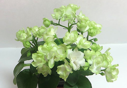 Густо-махровые белые цветки с широкой сочно-зеленой каймой; листва очень миниатюрная ровная в форме лодочки. Мини