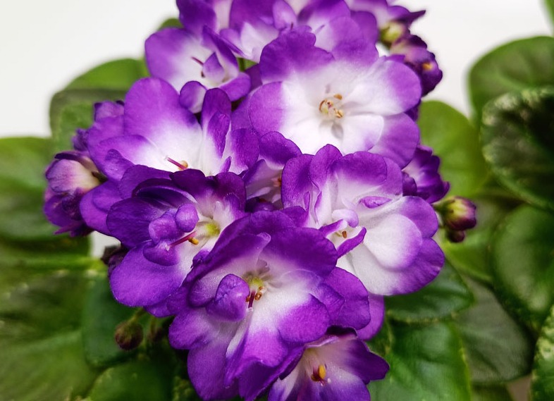 Белые махровые розочки с красивой темно-вишневой гофрированной каймой. Малый стандарт, очень компактная розетка со средне-зелеными слегка волнистыми листьями. Я выращиваю в горшке 5,5 как полуминиатюру.