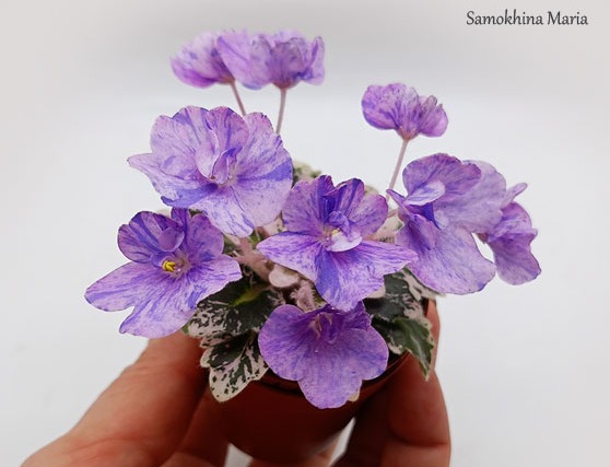 Полумахровые или махровые цветы небесно-голубого цвета. Очень красивая ровная розетка с ярко выраженной кроновой пестролистностью. Полуминиатюра.