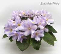 Гроздья крупных махровых белых цветов с голубыми химерообразными лучами из центра. Блестящая оливково-зеленая сердцевидная гел-листва; аккуратная полуминиатюрная розетка. Устойчивый спорт от сорта Н-Январь.