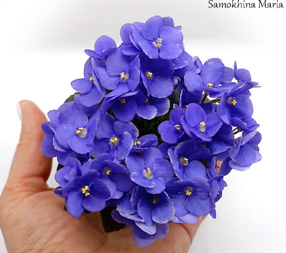 Полумахровые темно-голубые цветы с тонкой белой каймой. Средне-зеленая гёл-листва. Миниатюра.