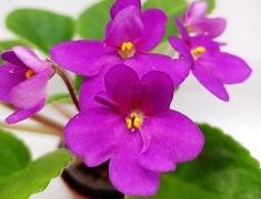 Полумахровые или махровые атласно-розовые звездочки с белой каймой. Замшевая сердцевидная темно-зеленая листва с большим количеством розового и белого. Аккуратная полуминиатюрная розетка.