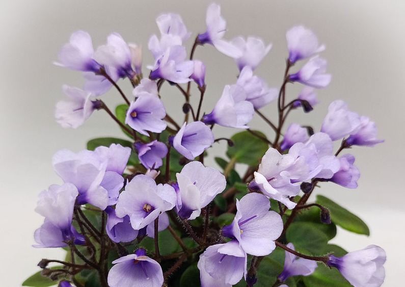 Оригинальная высокая розетка со стеблем, похожая на трейлер, усыпана густомахровыми светло-розовыми цветками с темными подпалинами на кончиках. Листва мелкая резная.